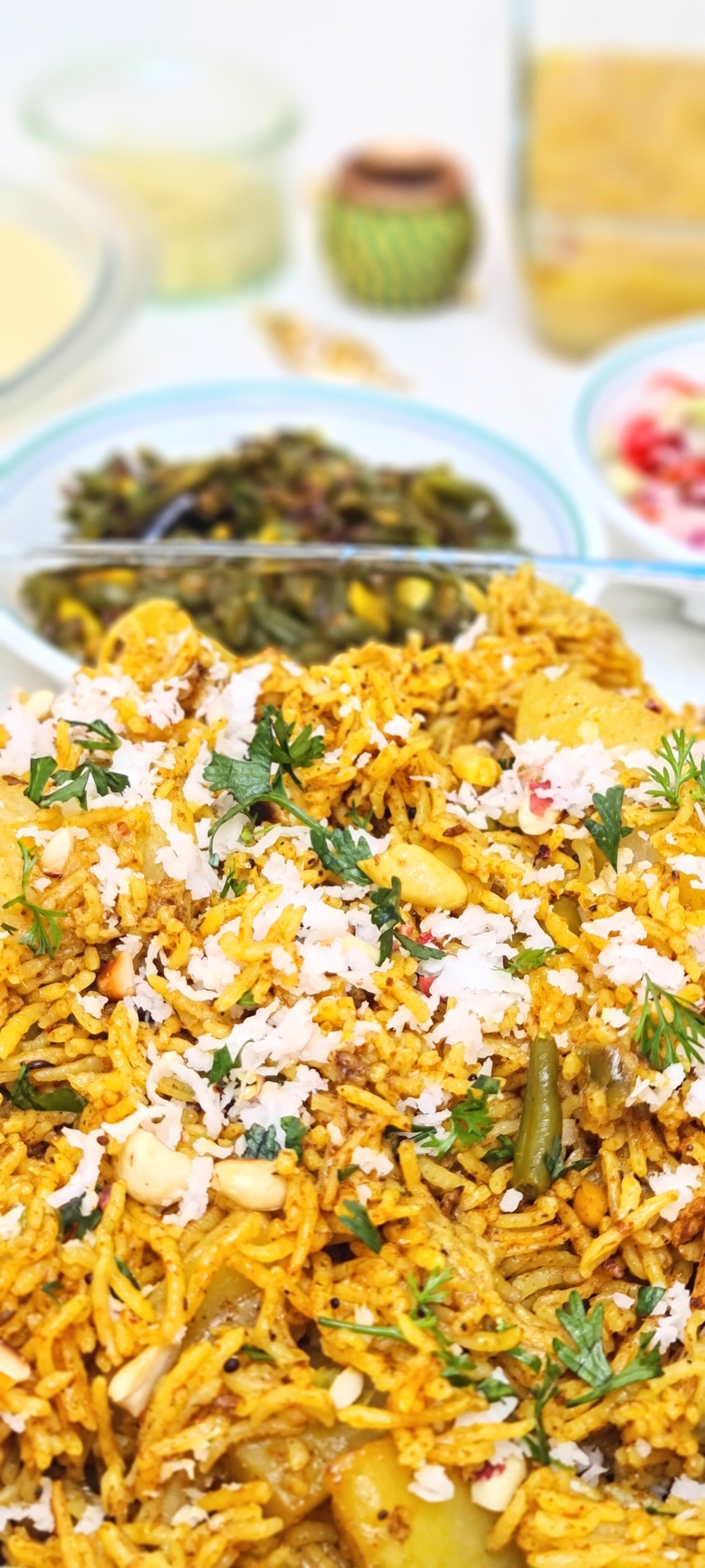 Accompaniments- kadhi, shengdana koshambir, coconut chutney, beans sabji, sheera.